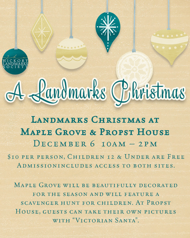 Maple Grove will be beautifully decorated for the season and will feature a scavenger hunt for children. At Propst House, guests can take their own pictures with “Victorian Santa”.