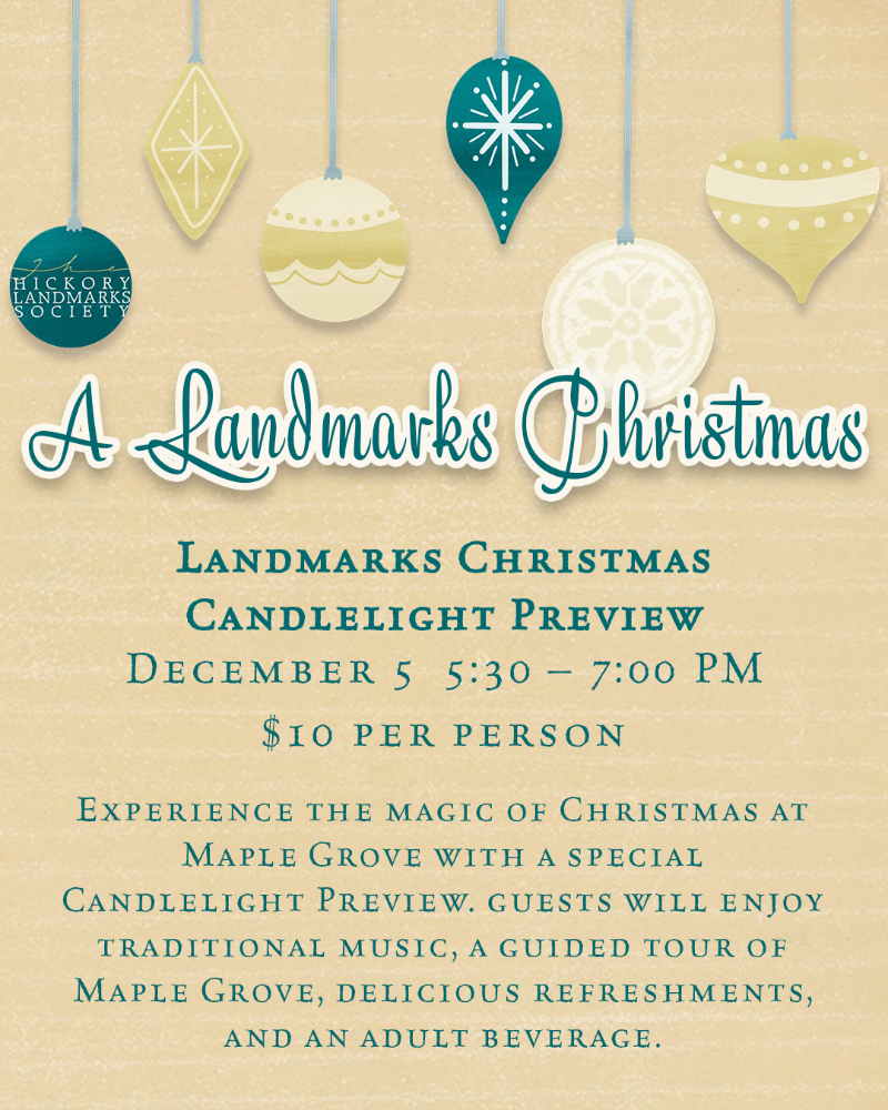 Experience the magic of Christmas at Maple Grove with a special candlelight preview. Guests will enjoy traditional music, a guided tour of Maple Grove, delicious refreshments, and an adult beverage.